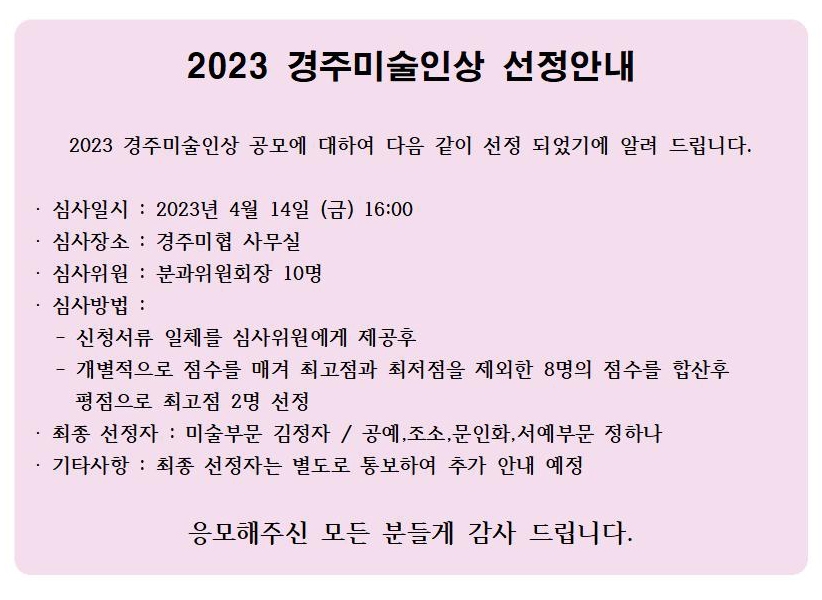 2023³â ¿ÃÇØÀÇ °æÁÖ ¹Ì¼úÀÎ»ó ¼±Á¤ ¾È³»
