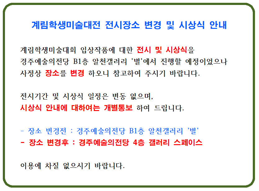 °è¸²Çлý¹Ì¼ú´ëÀü Àü½ÃÀå¼Ò º¯°æ ¹× ½Ã»ó½Ä ¾È³»