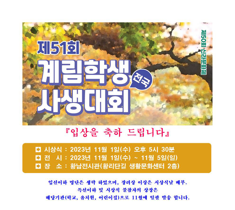 Á¦51ȸ °è¸²Çлý¹Ì¼ú´ëȸ ÀÔ»óÀÚ ¸í´Ü *** ÁßµîºÎ ÃÖ¿ì¼ö ±èÀÌÁ¤(¼±´ö¿©Áß)À» ±èÀÌÁ¤(°æÁÖ¿©Áß)À¸·Î Á¤Á¤ ÇÕ´Ï´Ù. 2023.10.19. 10:55